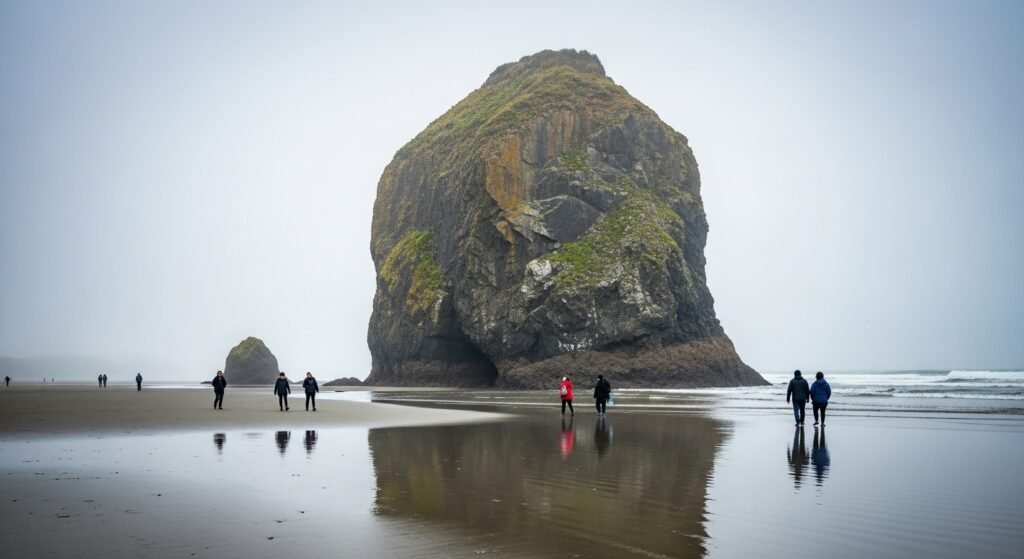 A hazy glow hangs around Haystack Rock, where Cannon Beach unfolds under wild sky lines. Sunlight softens the place at dawn, yet it quietly intensifies when the sea pulls back at low tide.