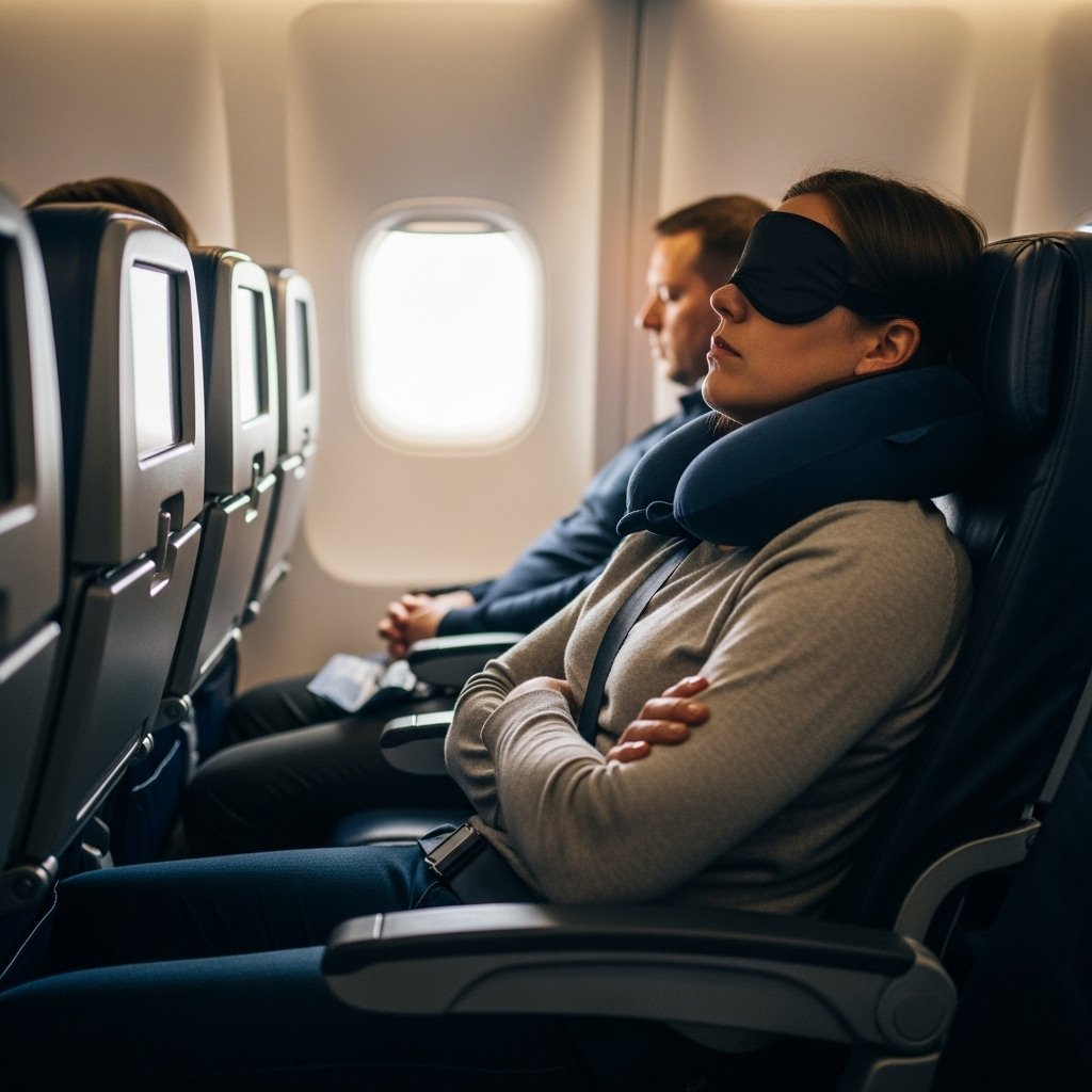 Adjust to destination time before takeoff, like eating and sleeping accordingly. Use eye mask, earplugs, and a pillow to block everything out. Many aim to nap right after takeoff or during “night” hours on the plane.
