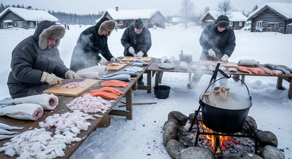 The local food is designed to keep one warm and alive. It is composed of frozen raw fish known as stroganina, horse meat, and fat bone broths. There is no counting of calories here; it is preserved. Each meal is aimed at ensuring that the body produces heat even under temperatures that would paralyse most humans.