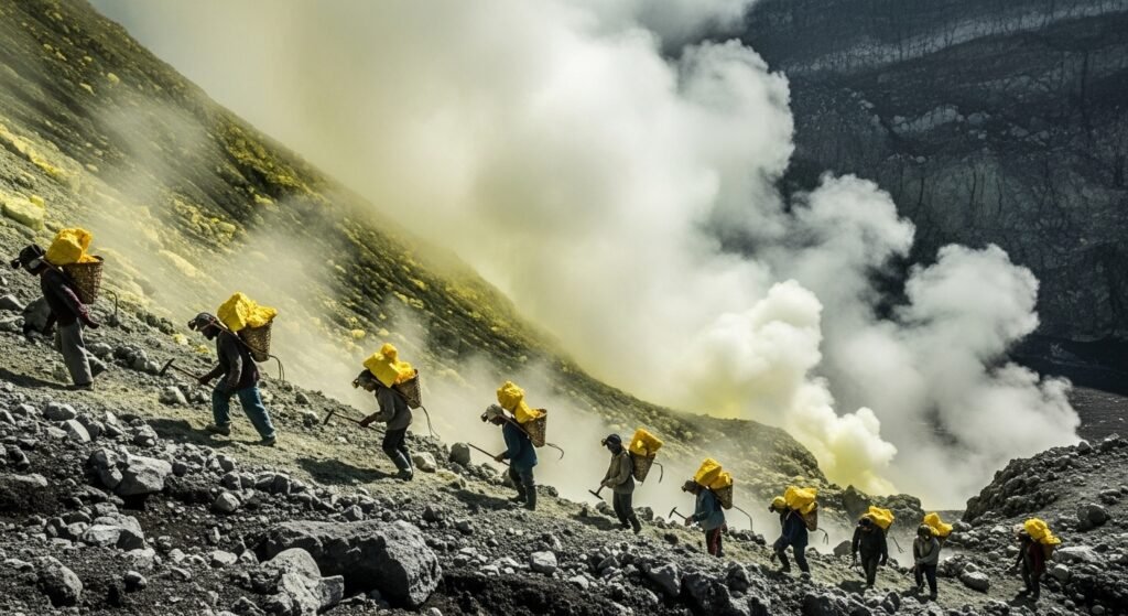 On Java’s Kawah Ijen volcano, miners descend daily into an active crater to excavate bright yellow sulfur by hand, then carry blocks weighing up to 175 pounds up steep crater walls. Extracted sulfur supplies fertilizer production and manufacturing operations throughout East Java’s industrial sector.