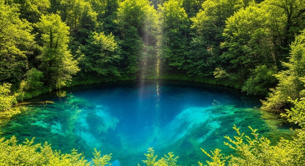 The Blue Eye or Syri i Kalter, a natural fresh water spring, 20 kilometers southwest of the coastal city of Saranda is a natural phenomenon with ice-cold water bubbling out of underground caves into a clear turquoise pool bordered by thick forest. It is among the natural landmarks that are always photographed in Albania.