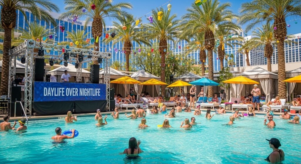 Las Vegas has always climaxed at night, which is why the energy has traditionally reached its height post the sunset; however, the emergence of modern tourism has spread to elaborate pool parties and experiences during the day. And though animated and full of fashion, such a diffusion through time brings a new lightness to the city. It was neutralized to the drama of dark mornings and electric evenings that formerly composed the rhythm.